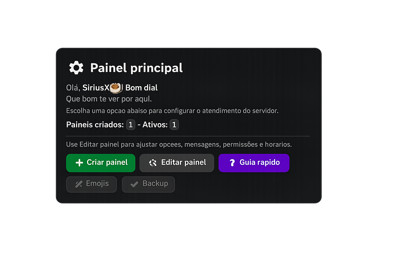 Paineis de tickets com botoes e opcoes configuraveis pelo /painel. Embed personalizavel.